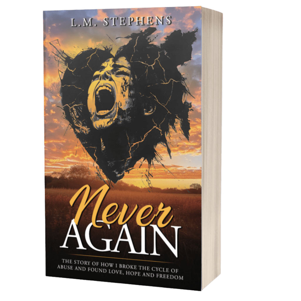 Never Again takes you on my journey through abuse to the other side where I found love, hope and freedom. I share stories from my life to show you that you aren’t alone. But I don’t leave you there. I also provide simple exercises to help get you through the storm and start on your healing journey.